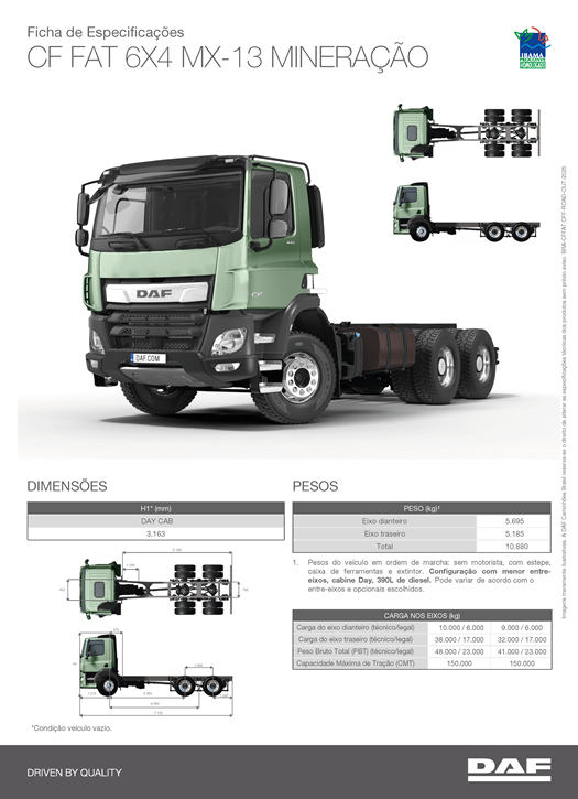 O DAF CF é adequado para transporte regional ou de médias distâncias; estradas impecáveis ou terrenos acidentados. Tudo é igual para a série DAF CF. Agora também está disponível como cavalo-mecânico ou chassi rígido. Fabricado para suportar as exigências do uso intenso, este caminhão multifuncional tem desempenho superior em qualquer aplicação desde o transporte de grãos ou de tanques até o trabalho pesado fora de estrada.